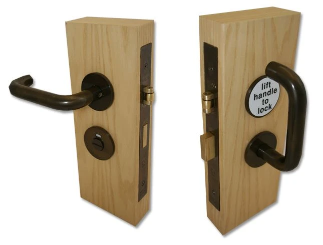 The inside lever handle presses down to release the latch bolt & lifts up to throw the dead bolt as illustrated this is an unusual feature & therefore has a sign to read “lift handle to lock” this message is repeated in Braille.