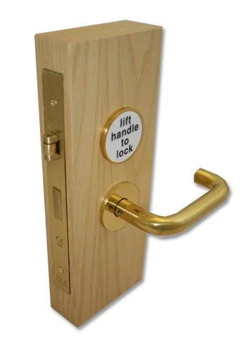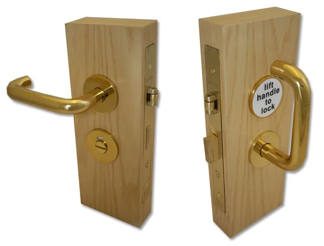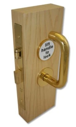 The inside lever handle presses down to release the latch bolt & lifts up to throw the dead bolt as illustrated this is an unusual feature & therefore has a sign to read โlift handle to lockโ this message is repeated in Braille.