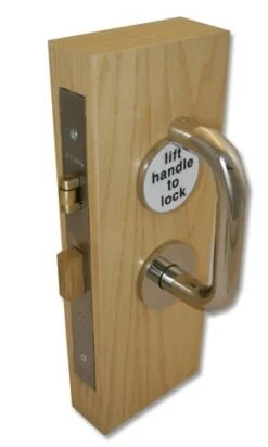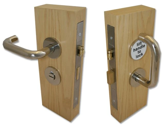 The inside lever handle presses down to release the latch bolt & lifts up to throw the dead bolt as illustrated this is an unusual feature & therefore has a sign to read “lift handle to lock” this message is repeated in Braille.