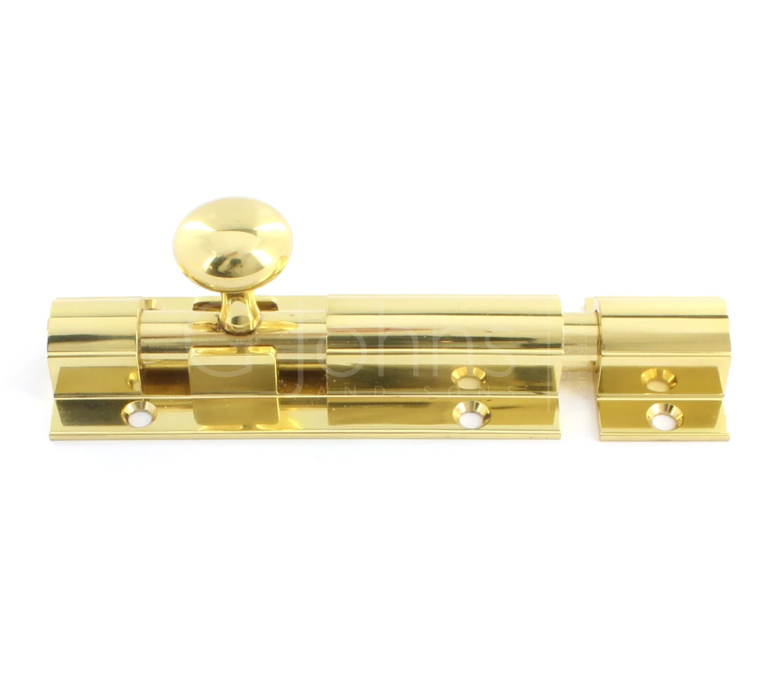 Architectural barrel bolt – Surface mounted – Supplied with 3 keeps – Suitable for inward or outward opening doors – 100mm x 38mm, 150mm x 38mm, 200mm x 38mm, 300mm x 38mm, 450mm x 38mm, 600mm x 38mm – Polished Brass