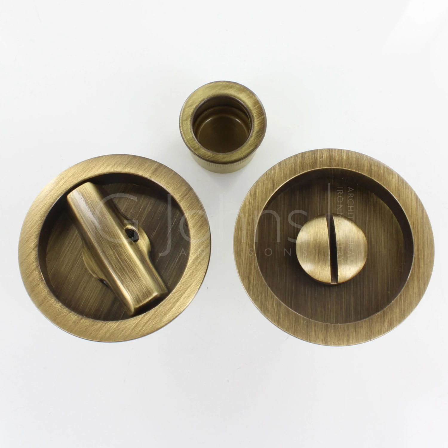 - Antique brass finish flush fitting bathroom hook lock set for sliding pocket doors.