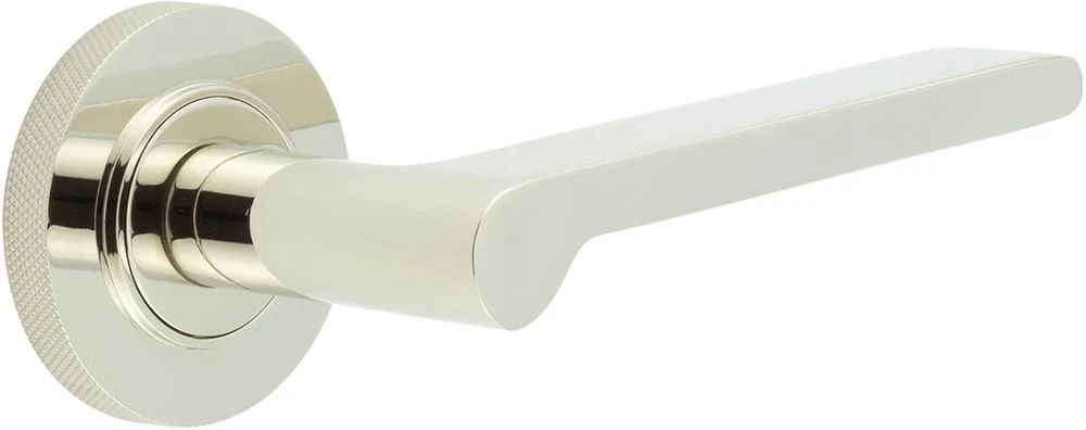 - Polished Nickel Blade pattern lever handles with knurled pattern concealed fix rose.