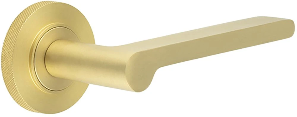 - Satin Brass Blade pattern lever handles with knurled pattern concealed fix rose.