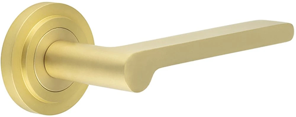 - Satin Brass Blade pattern lever handles with Stepped pattern concealed fix rose.