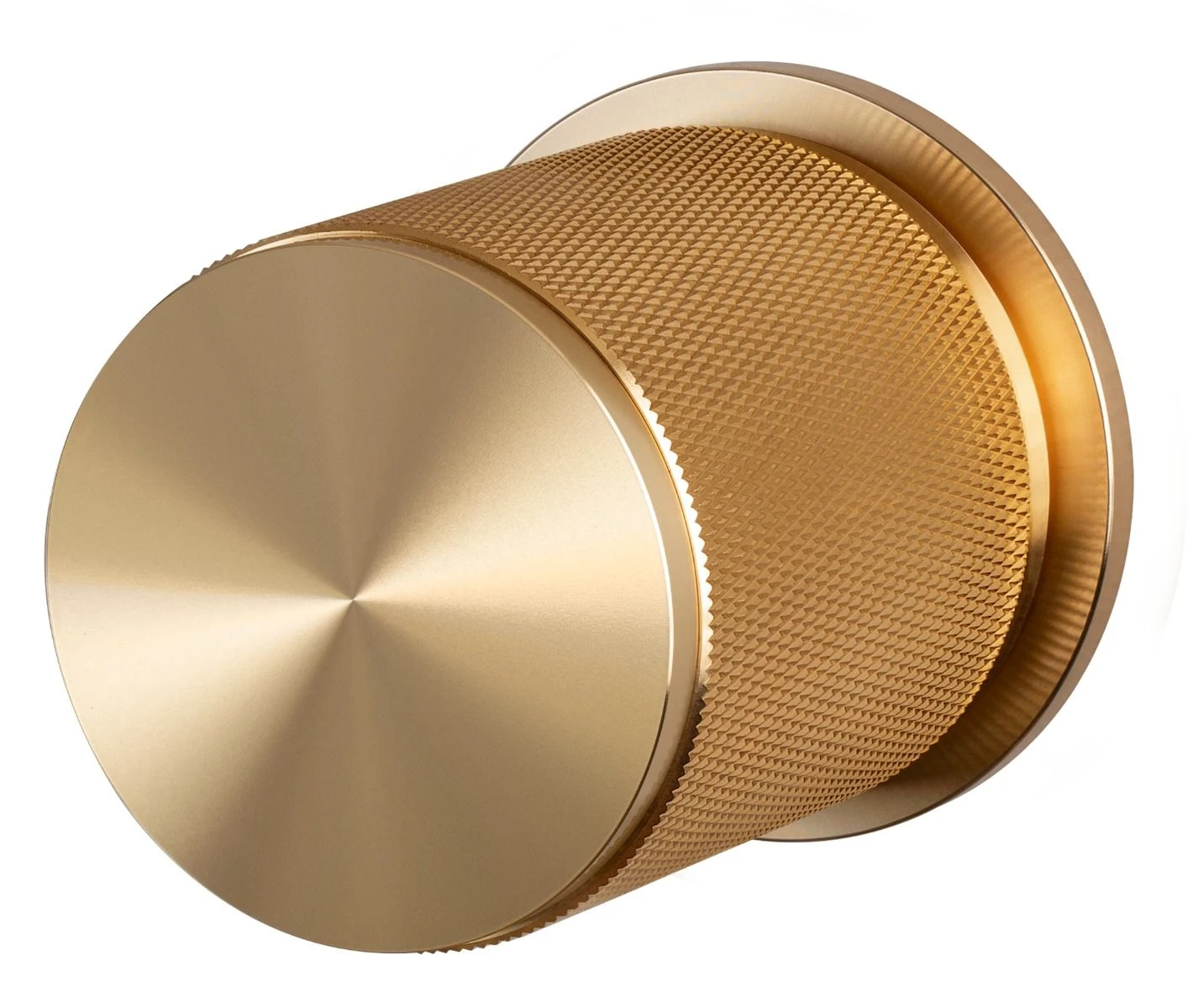 - Buster & Punch Diamond cut knurled pattern cylinder shape mortice door knobs, satin brass finish.