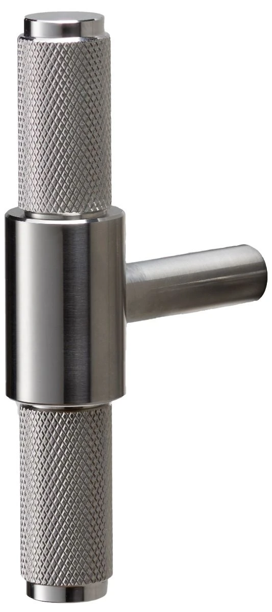 - Buster & knurled pattern T-Bar shape cabinet pull handle, satin stainless steel.