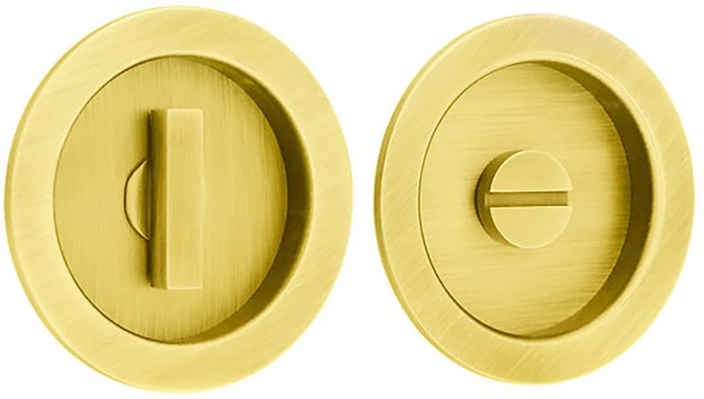 - Satin Brass finish flush fitting bathroom circular turn & release handleย set for sliding pocket doors.