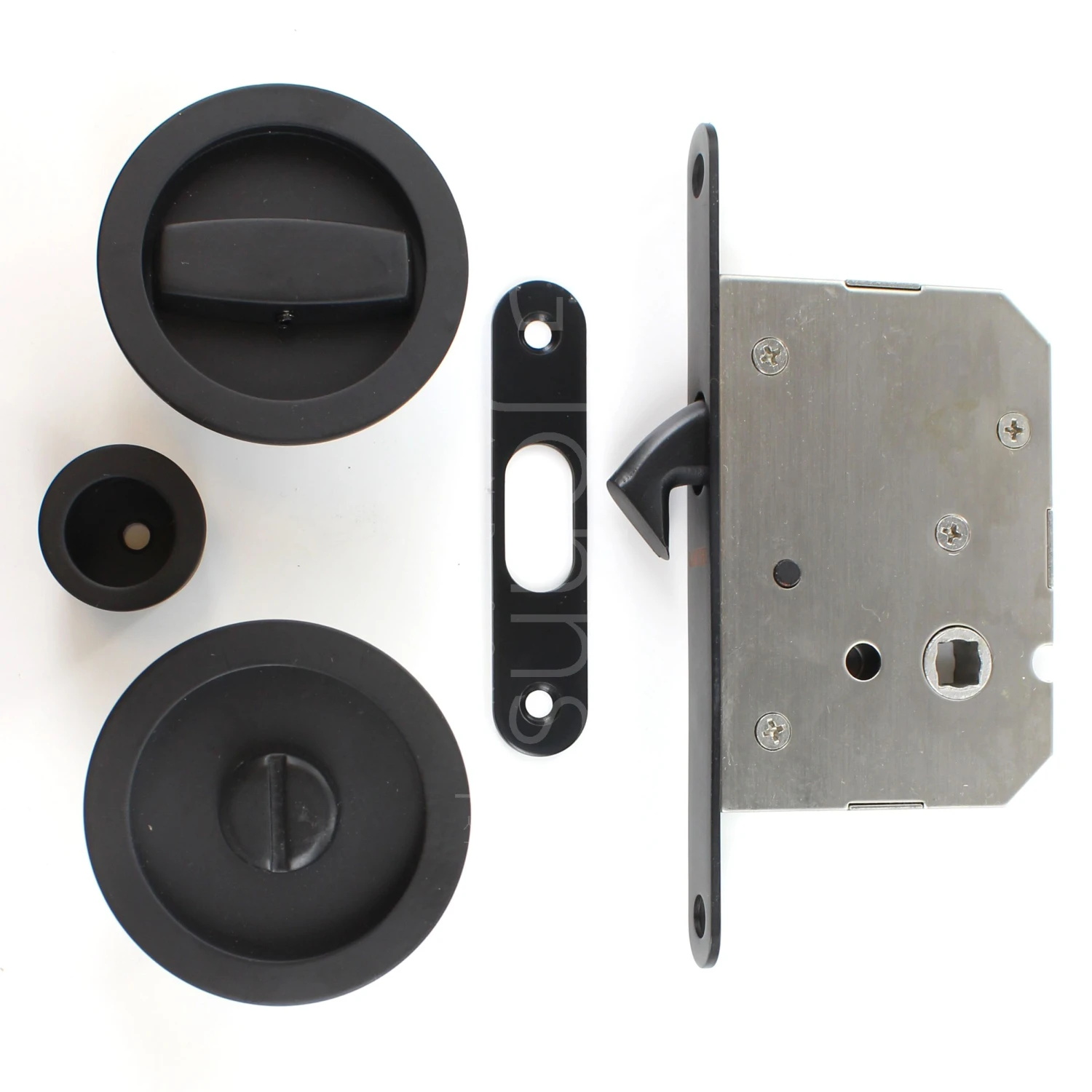 - Flush fitting bathroom hook lock set for sliding pocket doors.
