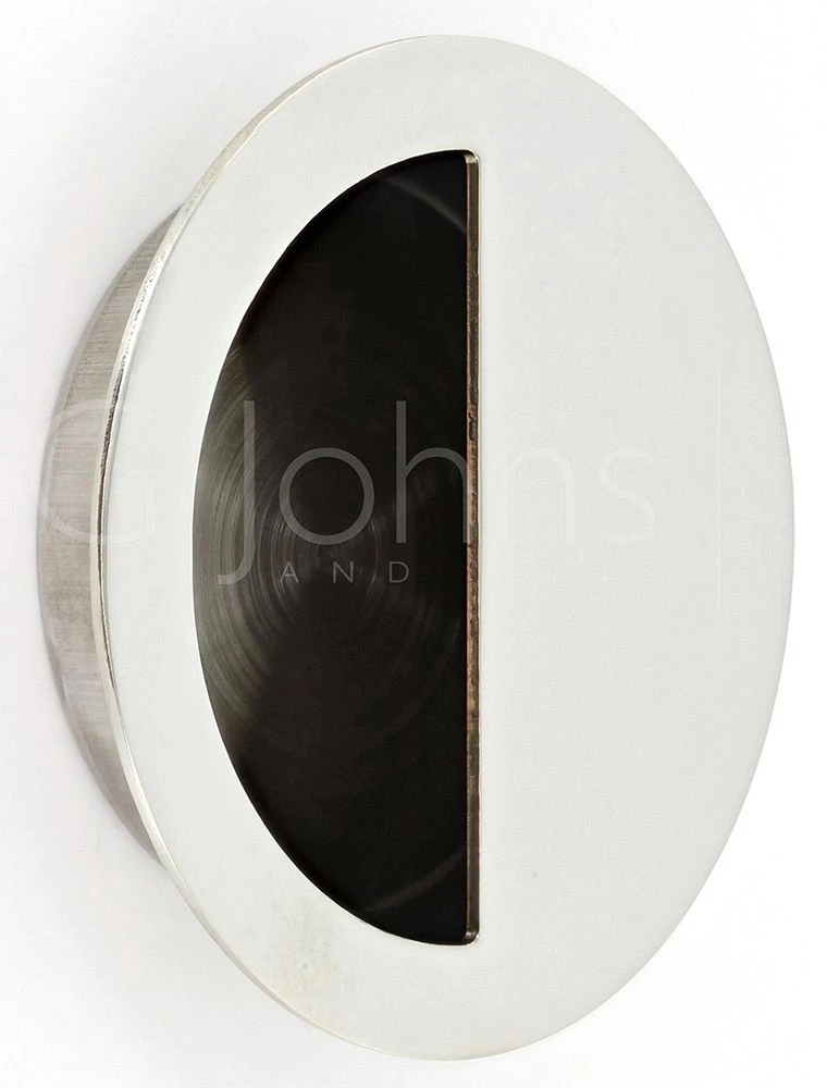 - Contemporary design circular shape flush fitting, inset pull handle with half moon grip ideal for use with sliding doors.