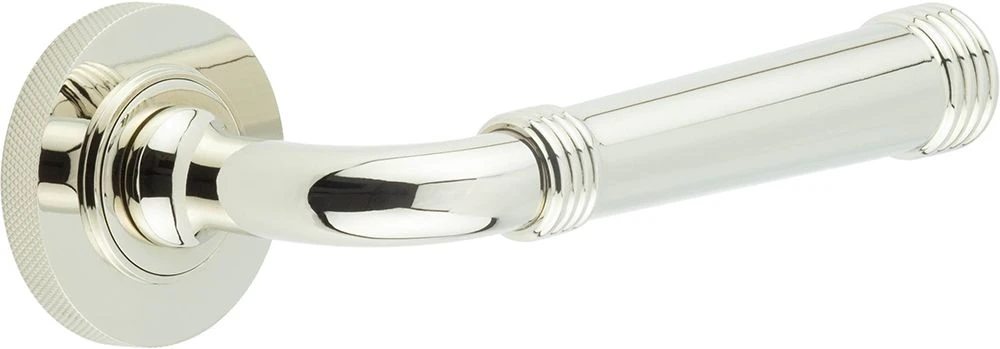 - Polished Nickel Classic pattern lever Handles With Ring Detail With knurled pattern concealed fix rose.
