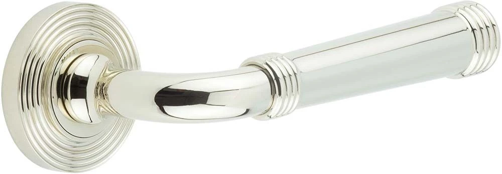 - Polished Nickel Classic pattern lever Handles With Ring Detail With reeded pattern concealed fix rose.