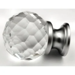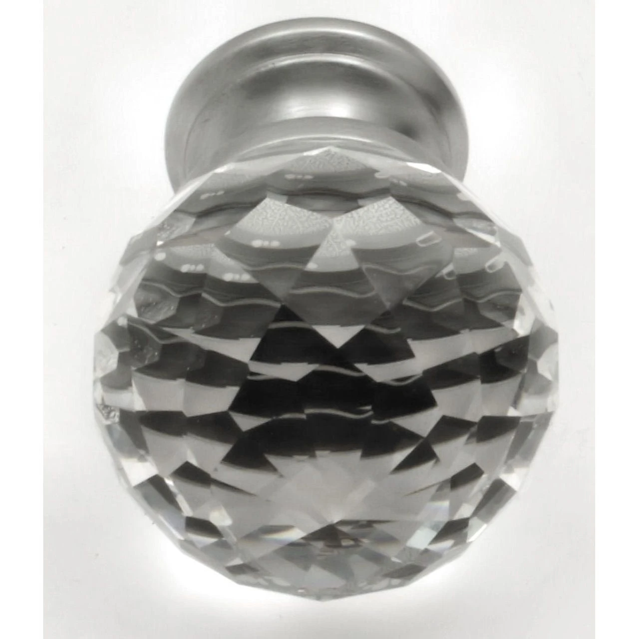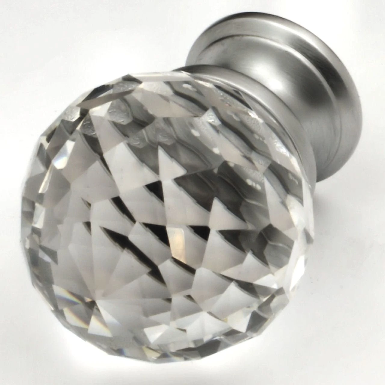 - Faceted shape cut glass style cupboard door knobs made from a clear / transparent glass with a brushed satin chrome plated back plat