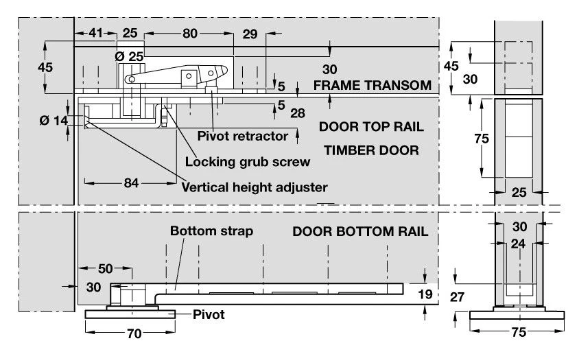 - Double action pivot set – allows doors to swing in both directions