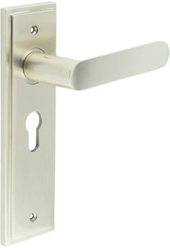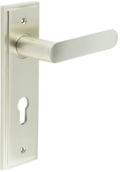 - Available in various plate designs including latch set for non locking doors, lock set for key locking doors, bathroom set that locks via a thumbturn and can be released in an emergency via a coin release on the outside handle, and a euro profile set for use with euro profile cylinders.