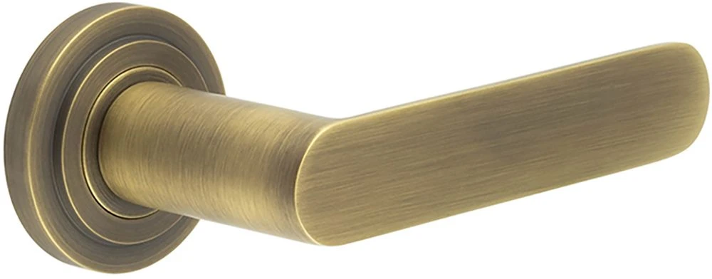 - Antique brass Flat Front pattern lever handles with stepped pattern concealed fix rose.