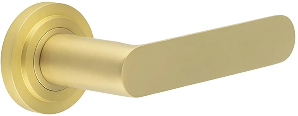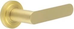 - Satin Brass Flat Front pattern lever handles with stepped pattern concealed fix rose.