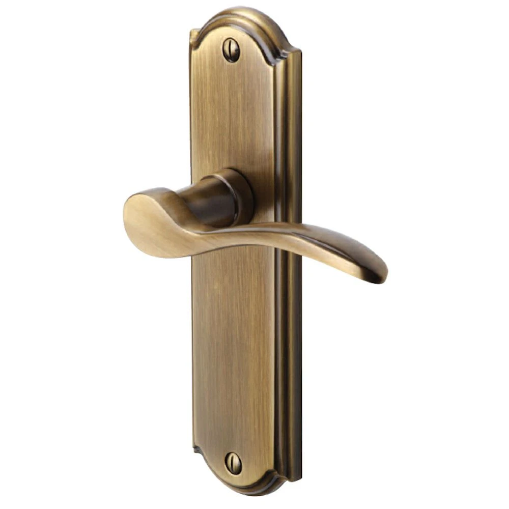 - The Light Antique Brass Howard lever suite from M Marcus is a traditional design door handle with a shaped backplate and a scrolled design lever.