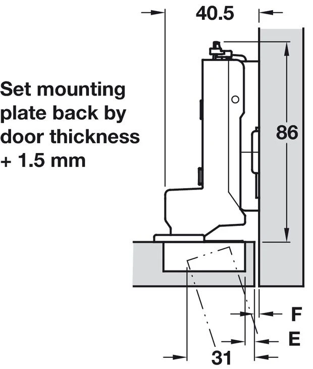 - Below diagram shows how the concealed blum style hinge clips on and off from the mounting plate.