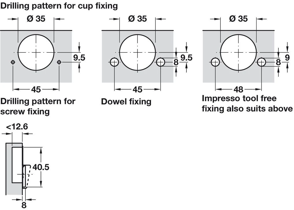 - Standard 35mm diameter cup. (Hole diameter required to be drilled into the door.)