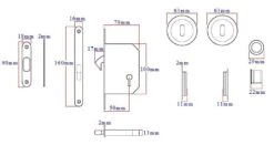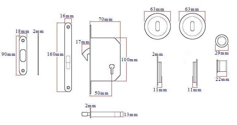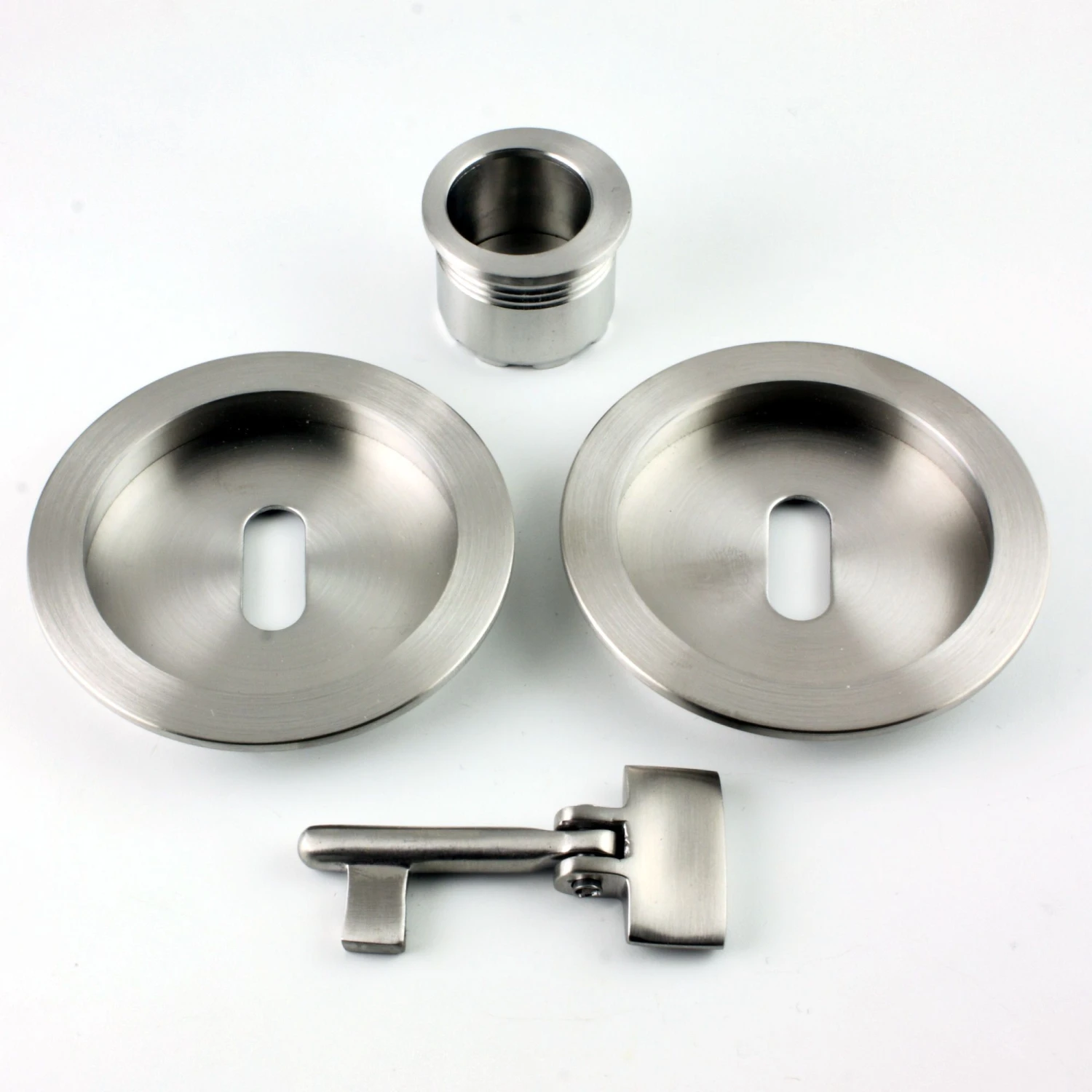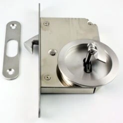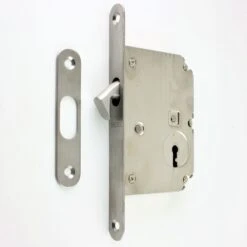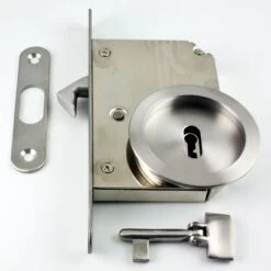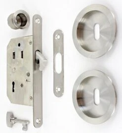 - Flush fitting key operated hook lock set for sliding pocket doors.