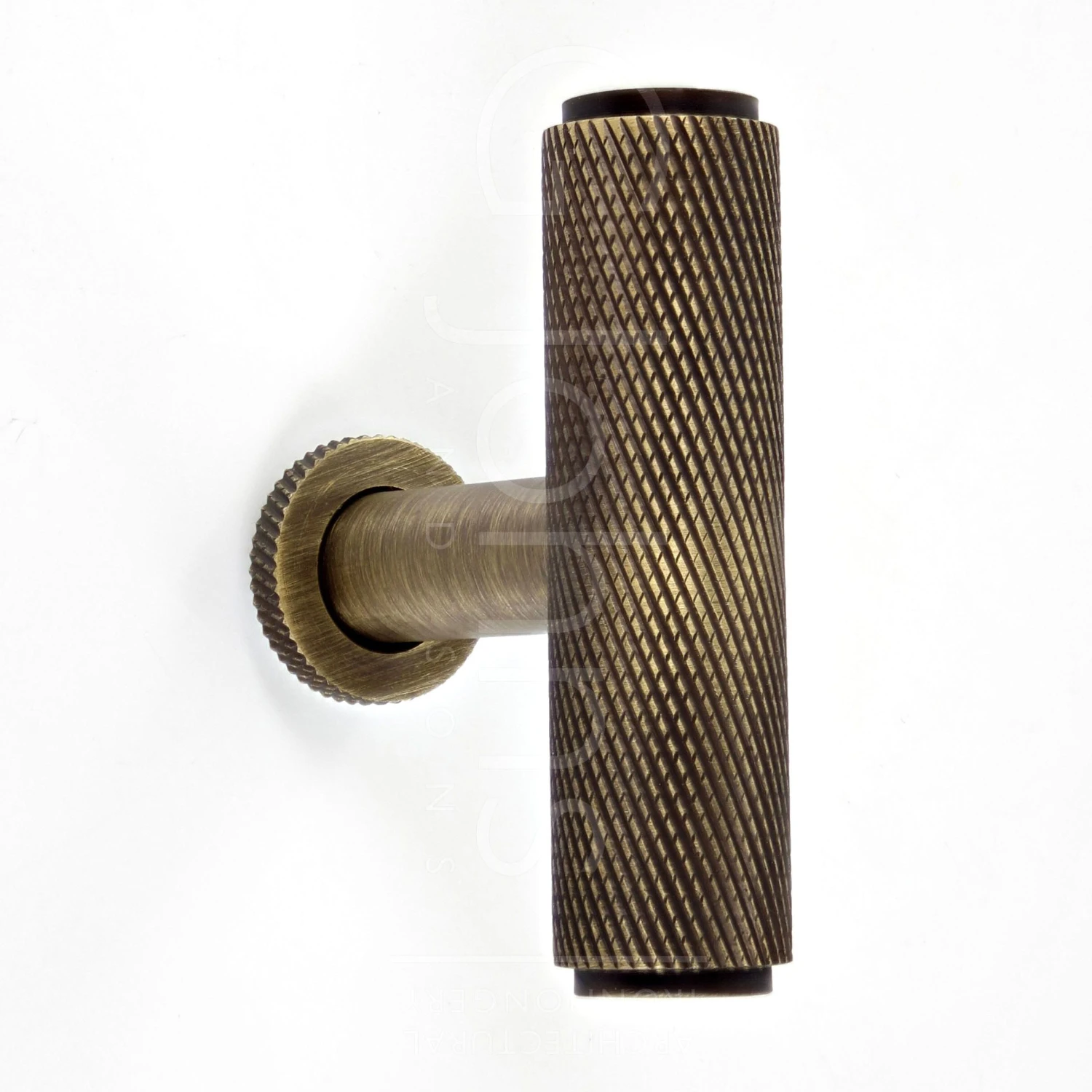 - Heavy quality, knurled T bar design stepped cupboard door knobs with an antique brass finish and optional round base rose