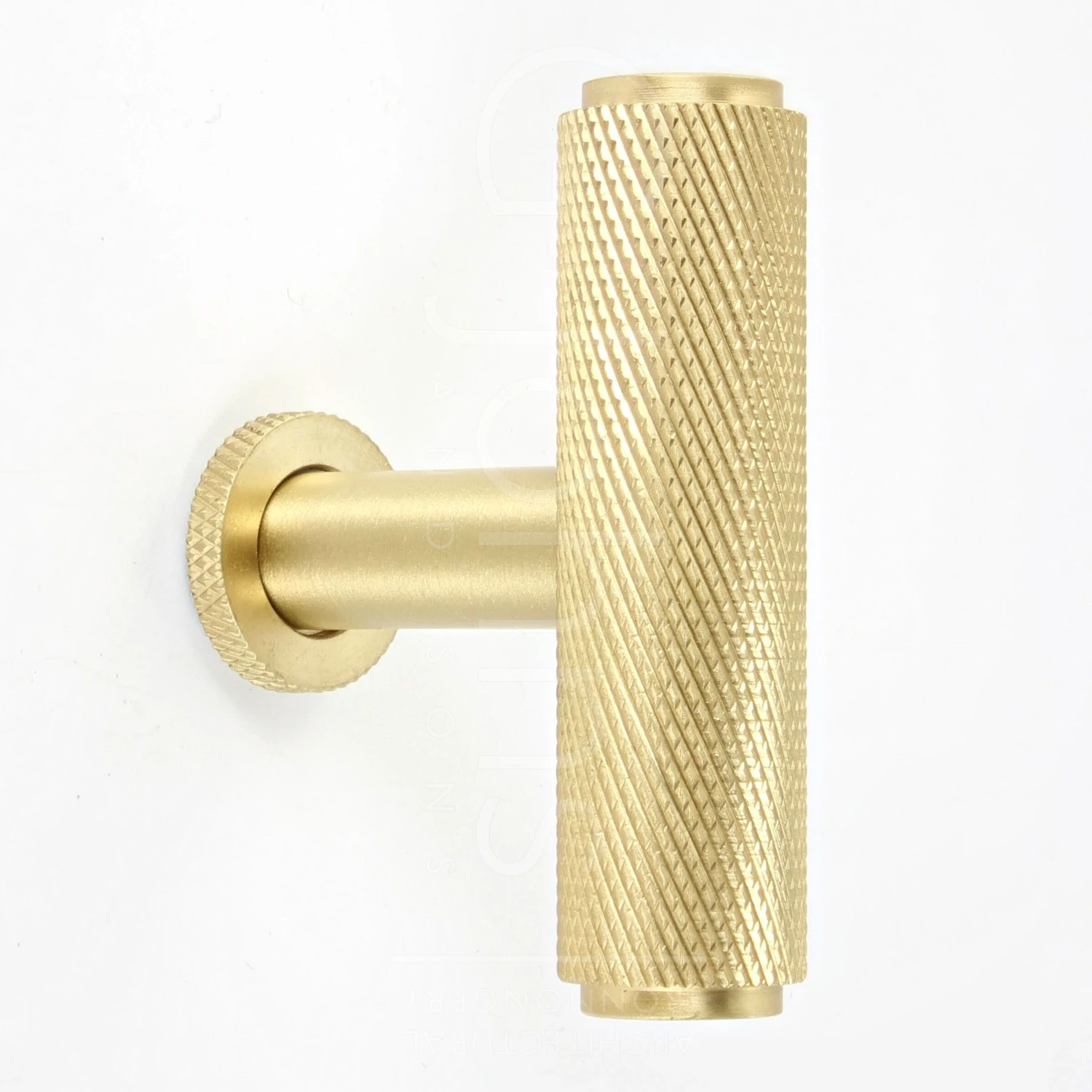 - Heavy quality, knurled T bar design stepped cupboard door knobs with an satin brass finish and optional round base rose