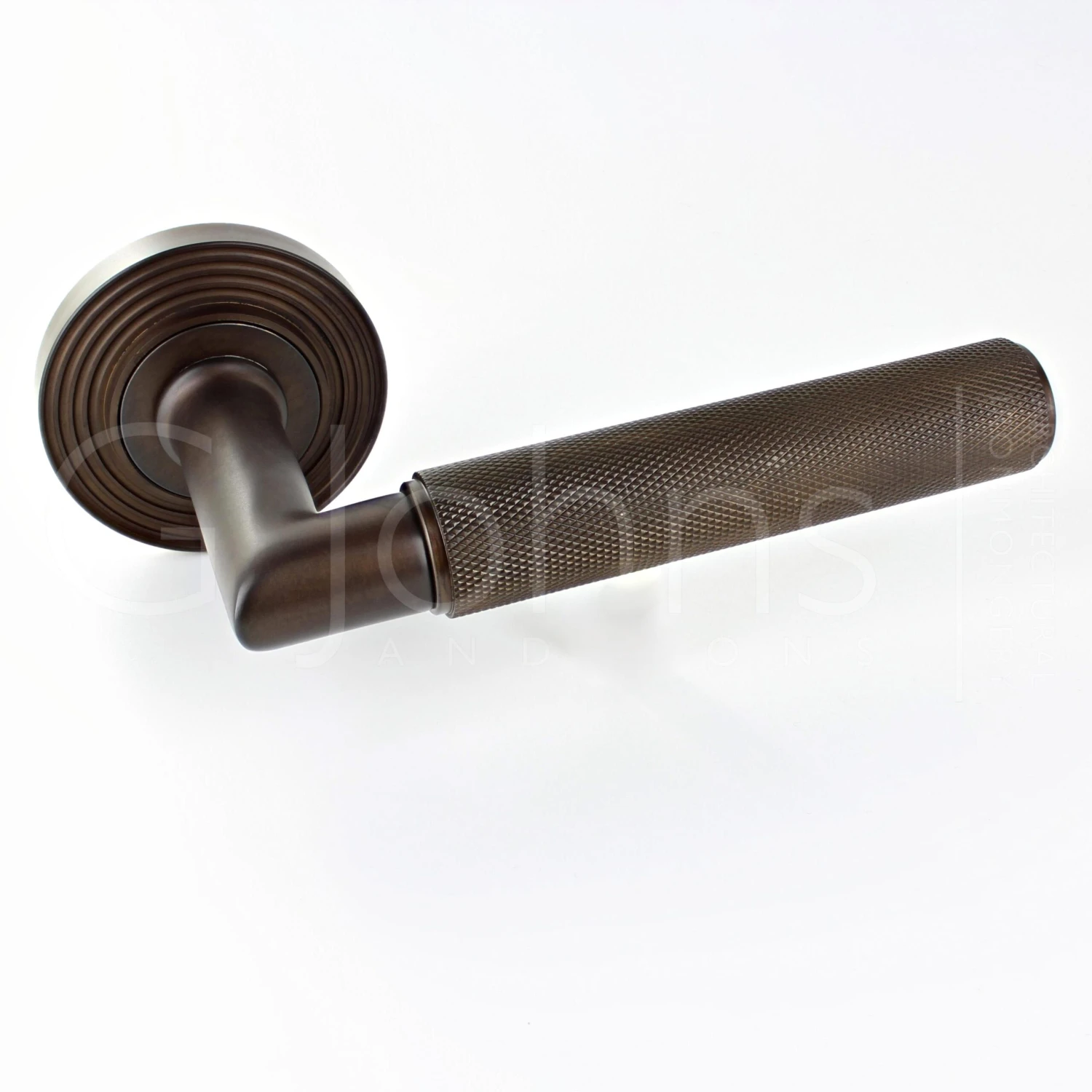 - Dark bronze knurled pattern lever handles with reeded pattern concealed fix rose.