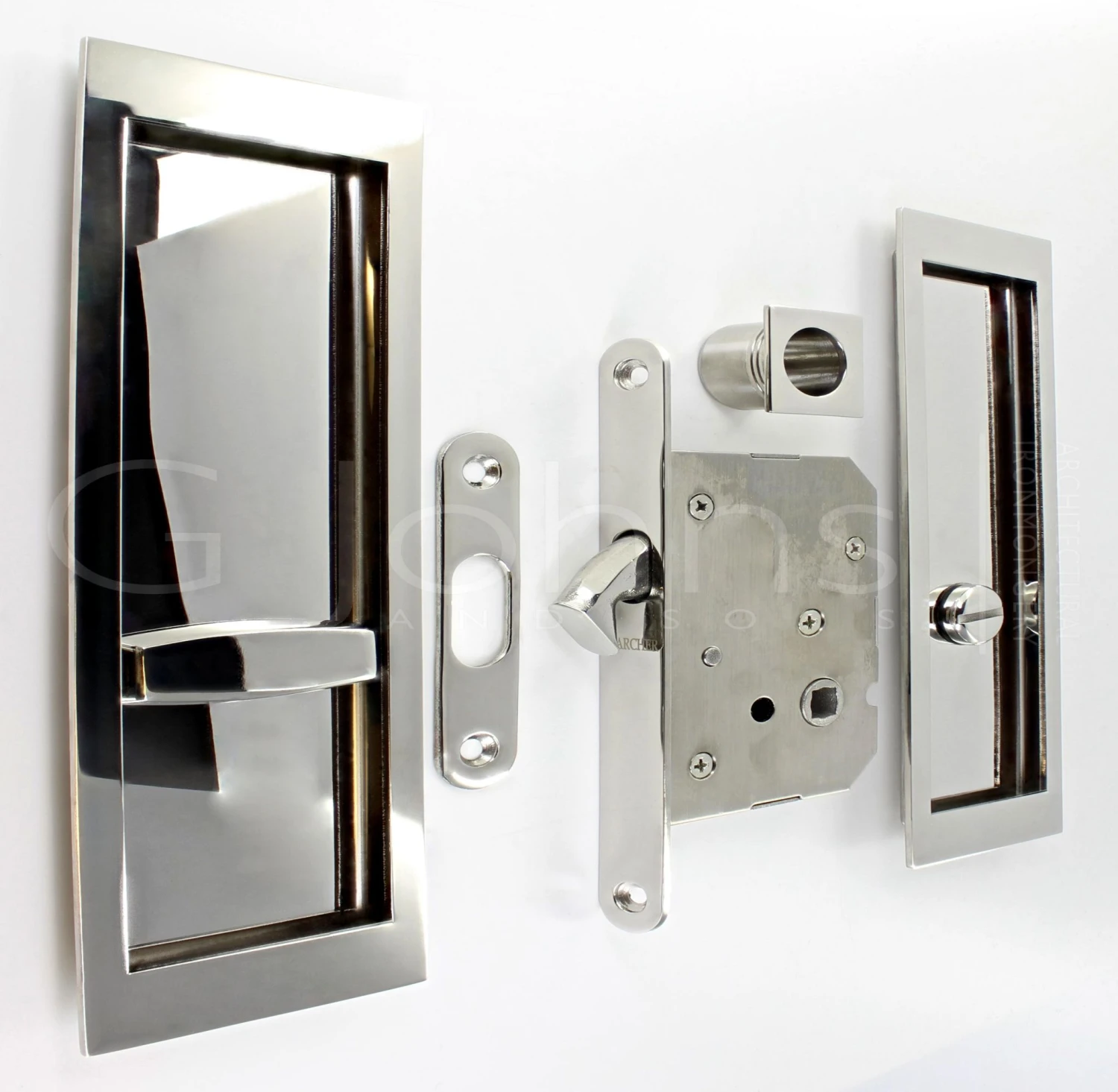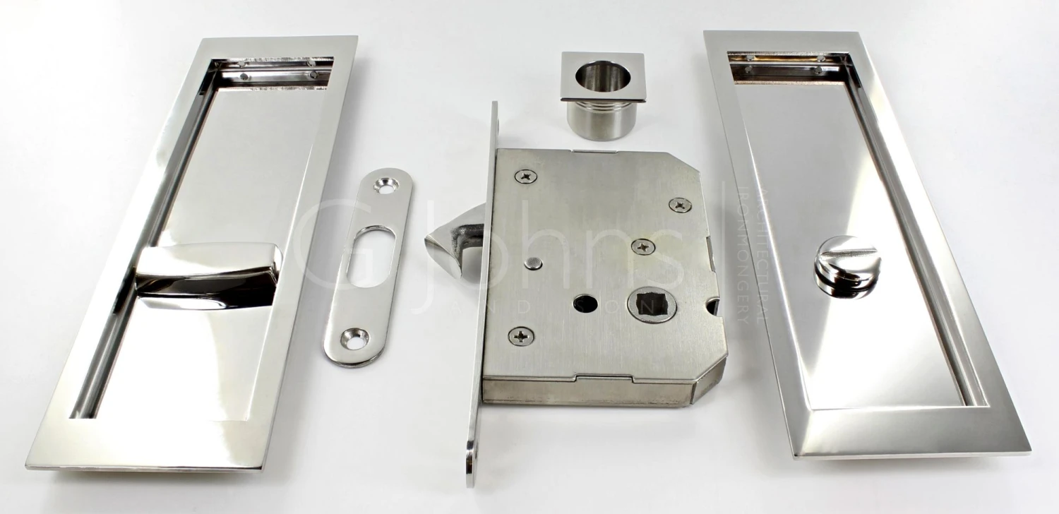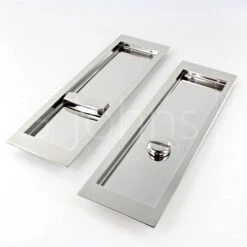 - Large rectangular shape flush fitting handles with bathroom turn and release and hook lock for sliding pocket doors.