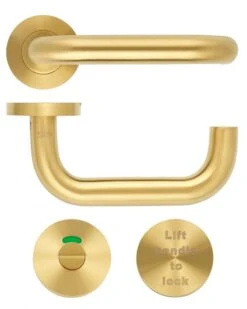 - 1 x PVD Satin Brass – “Lift Handle To Lock” escutcheon and sign