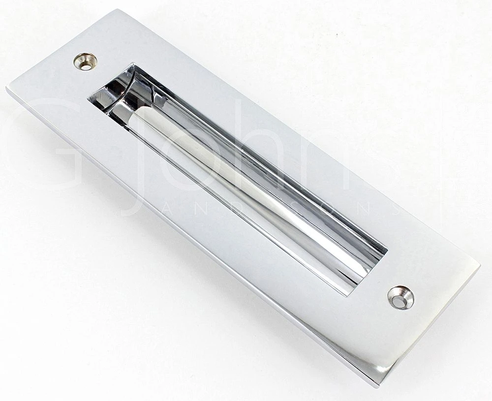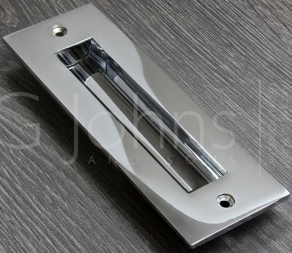 - Long rectangular shape polished chrome flush fitting inset handle for sliding doors.
