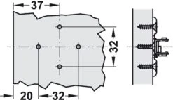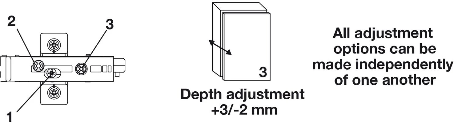 - Front to back adjustment – turning the screw at the tip of the hinge adjusts the door away from or toward the carcass with a total movement of 3.5mm possible.