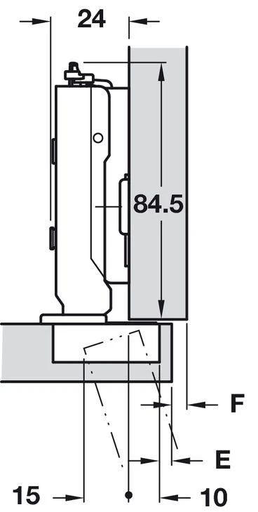 - Overlay hinge suitable for doors that sit on top of the cabinet carcass.