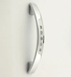 - A bow shape cabinet handle with square holes cut into the top face.