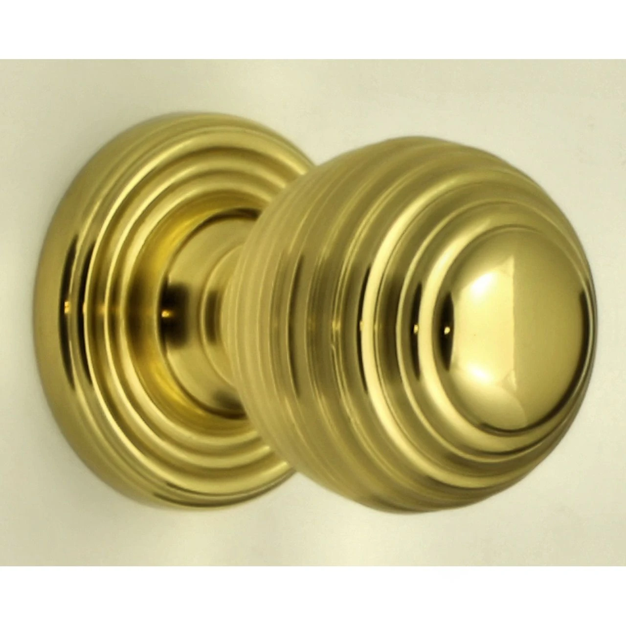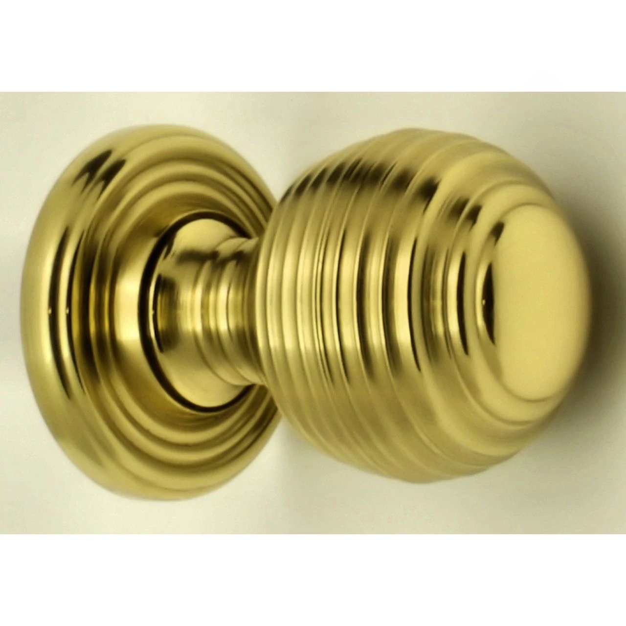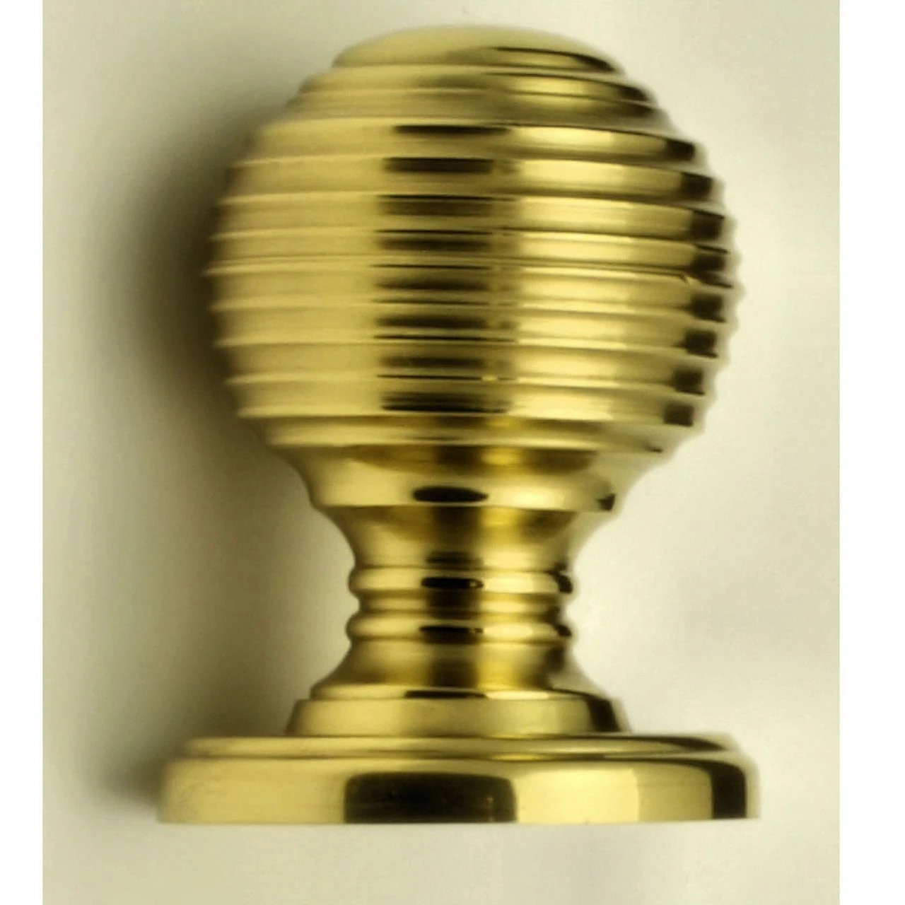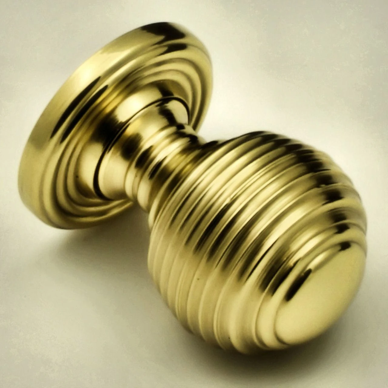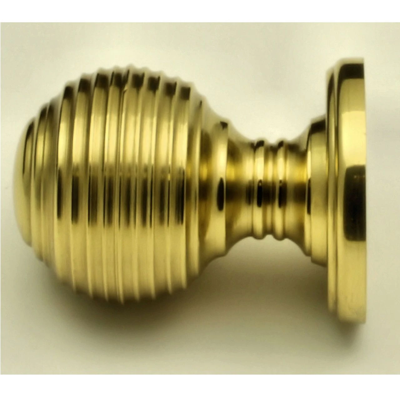 - Queen Anne style reeded pattern cupboard door knobs made from solid brass with a shiny polished finish.