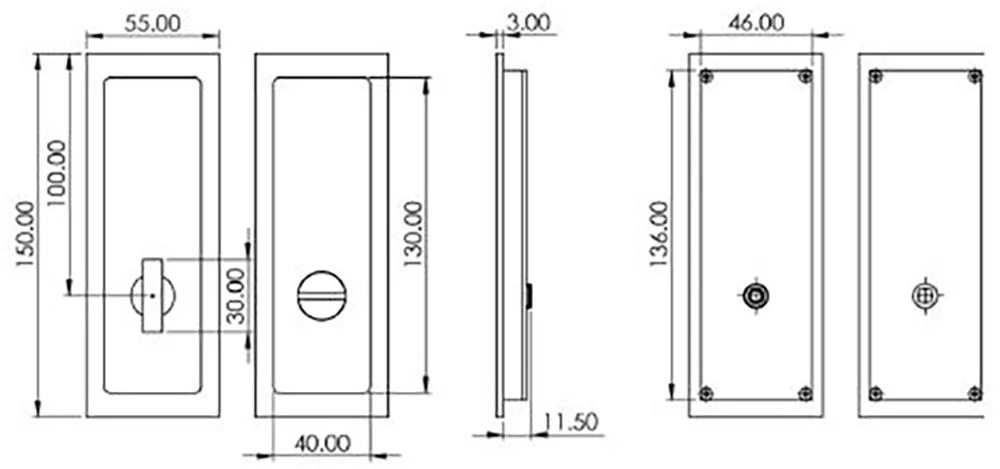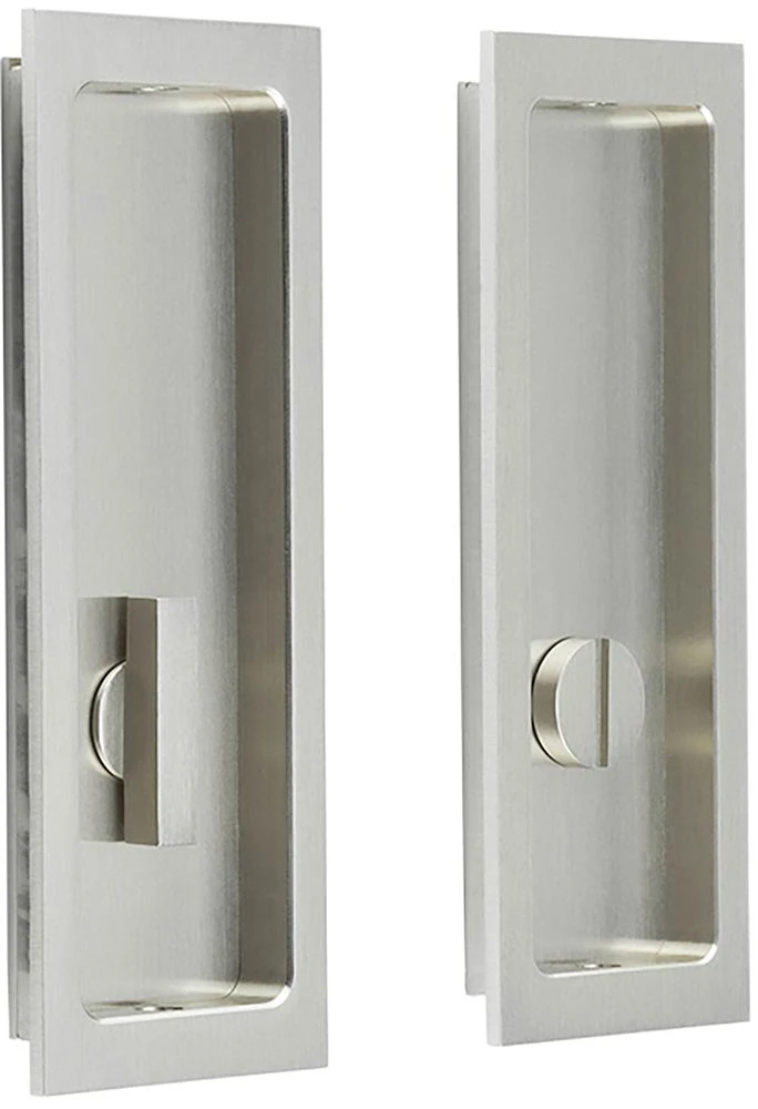 - Satin Nickel finish flush fitting bathroom rectangular turn & release handle set for sliding pocket doors.