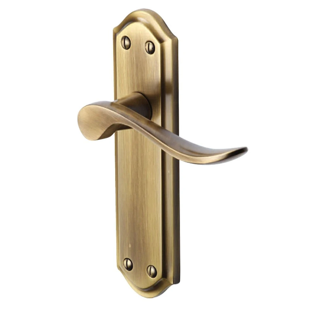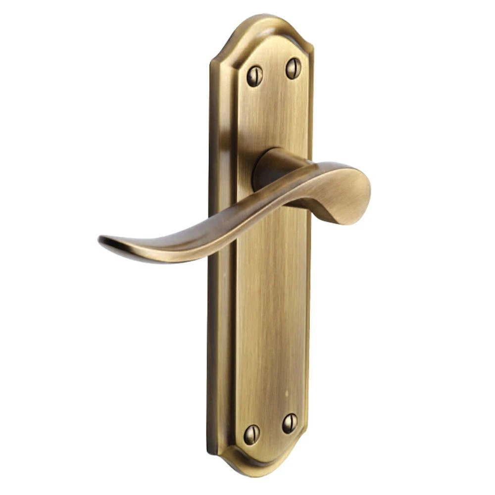 - The Light Antique Brass Sandown door handle suite has an antique finish with a shaped backplate and a scrolled design lever.
