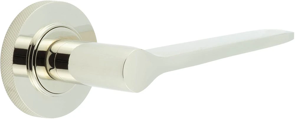 - Polished Nickel Tapered pattern lever handles with knurled pattern concealed fix rose.