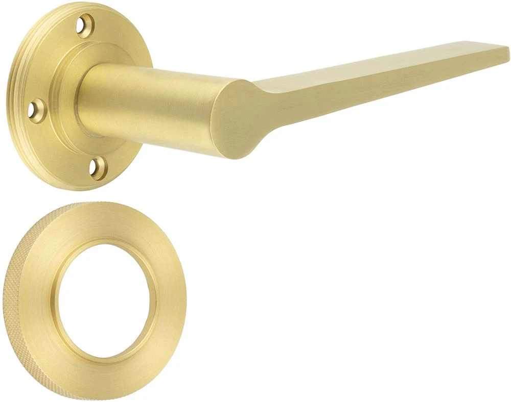 - Satin Brass Tapered pattern lever handles with knurled pattern concealed fix rose.