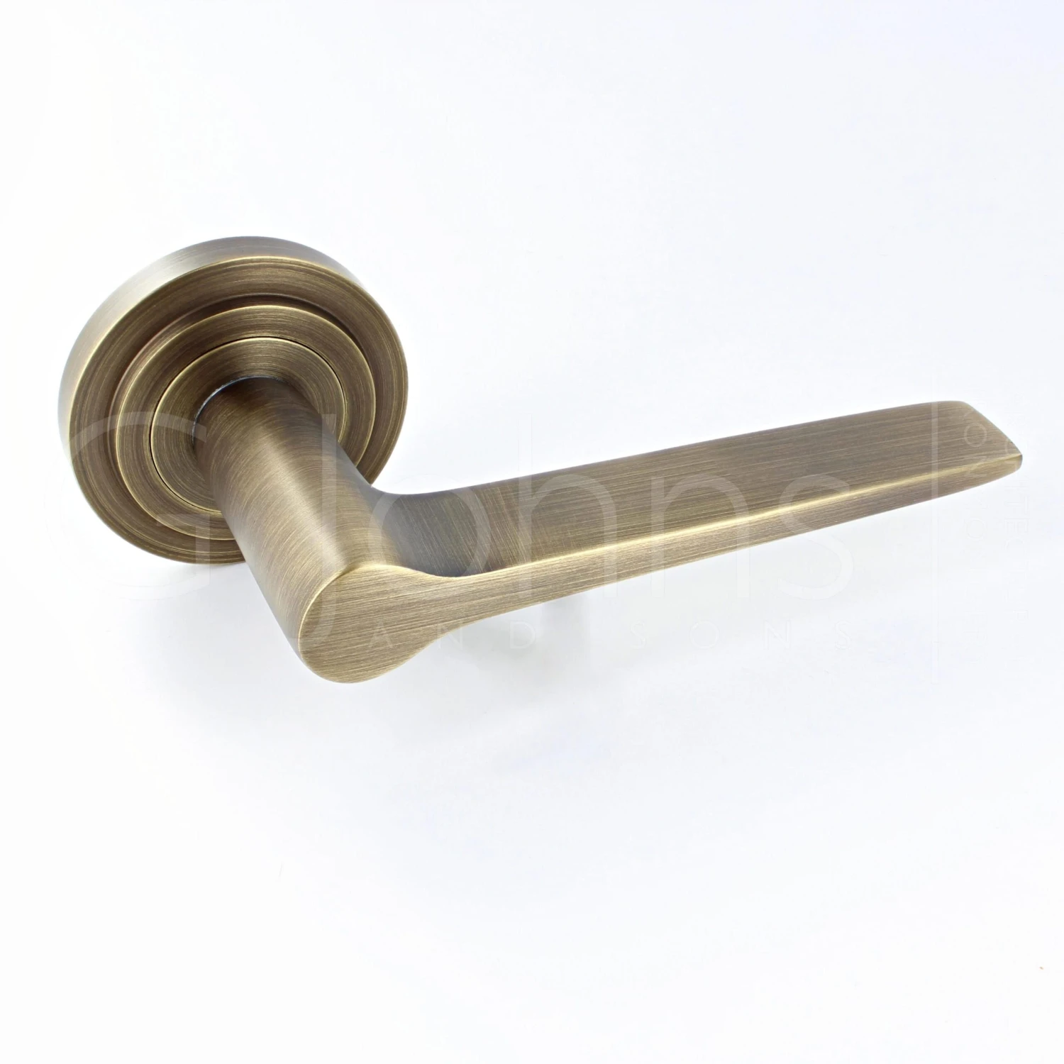 - Antique brass tapered pattern lever handles with stepped pattern concealed fix rose.