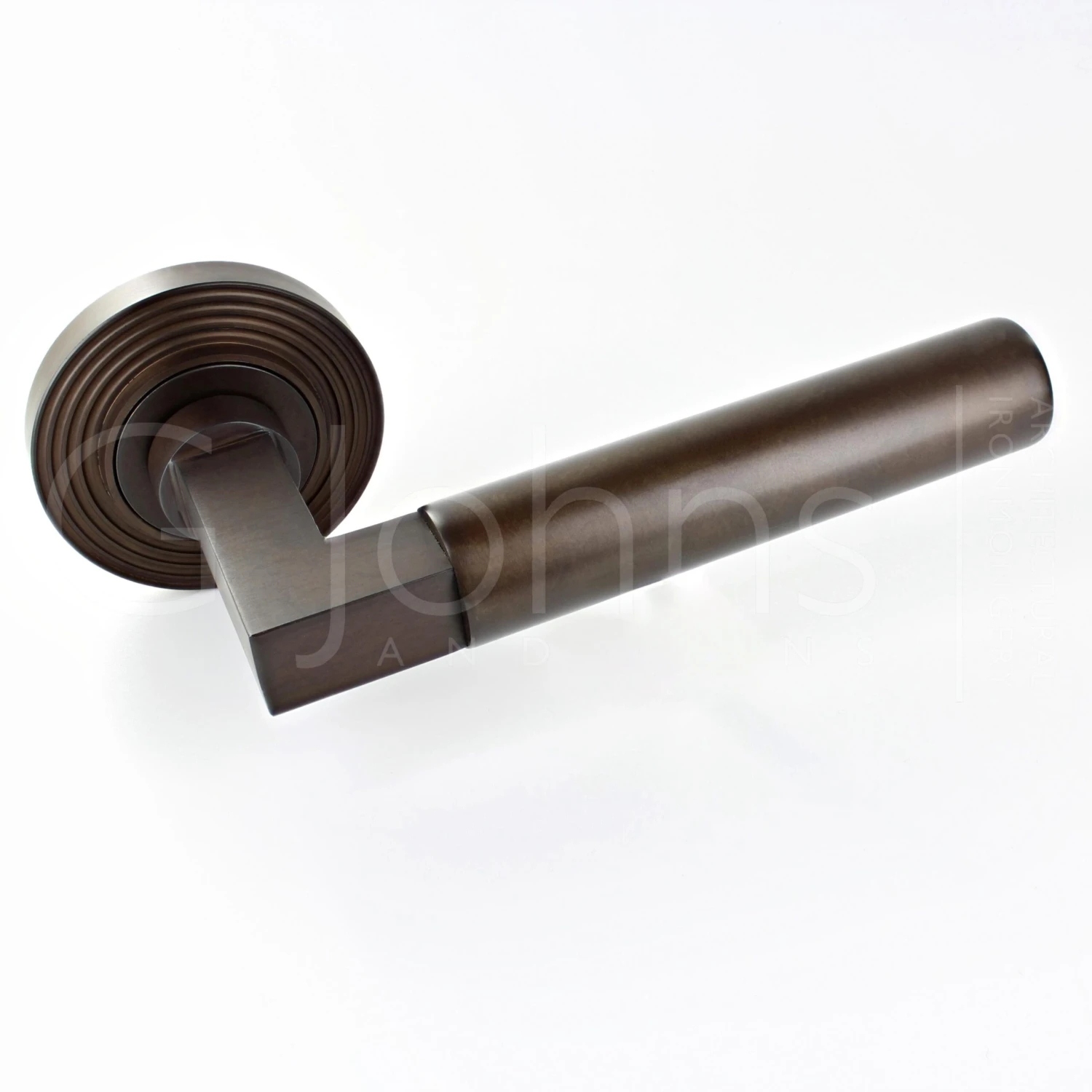 - Dark bronze tubular pattern lever handles with reeded pattern concealed fix rose.