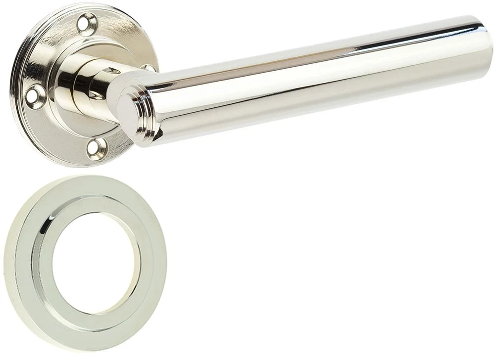 - Polished Nickel Tubular pattern lever Handles With Stepped Ends On stepped pattern concealed fix rose.